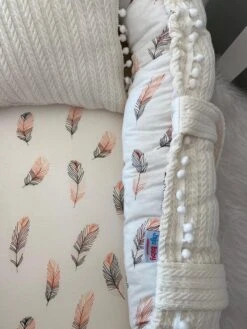 SNS Baby – Babynestje En Hoofdkussen – Organische Katoen – Antibacterieel Babynestje – Anti-Allergisch Babynestje – Wit En Veer Patroon – 74 X 40 Cm