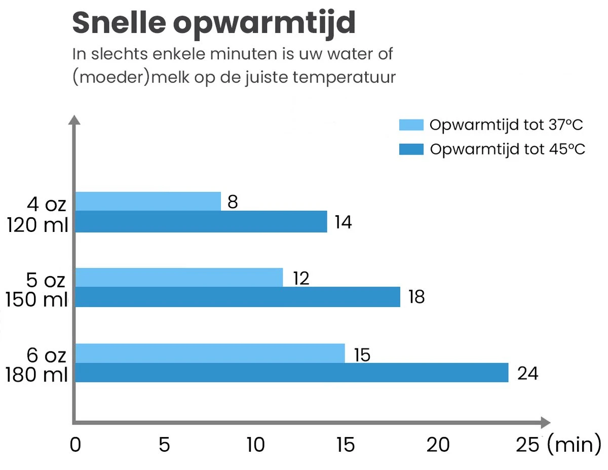De flessenverwarmer is speciaal ontworpen met de nieuwste technologie en heeft een snelwarmfunctie. Hierdoor verwarm je de (moeder)melk in slechts 8 tot 14 minuten. De babyfles wordt gelijkmatig verwarmt, zodat alle voedingsstoffen behouden blijven. Daarnaast schakelt de flessenverwarmer automatisch uit, zodat het flesje nooit te warm wordt.