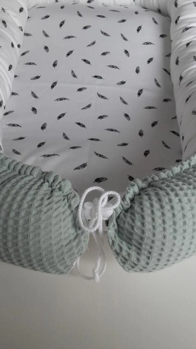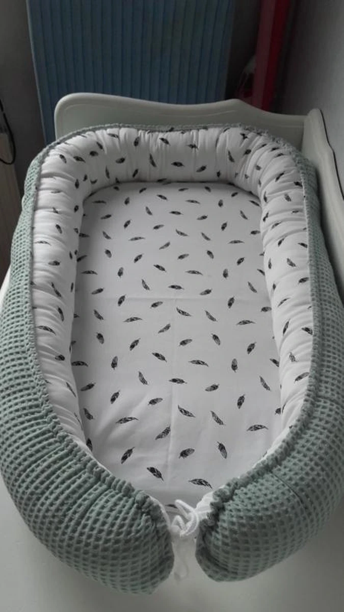 Lief zacht babynestje. De buitenkant is gemaakt van zachte wafelstof, met aan de binnenkant een lief katoentje. De lengte van het matrasje is 60 cm, en is uitneembaar. Uiteraard in allerlei kleuren en stofjes bij ons te bestellen. Bij het wassen altijd het klittenband sluiten, en de koortjes aan elkaar knopen. Was al onze artikelen de eerste keer in de wasmachine met koud water. Daarna kan het op 30 graden.