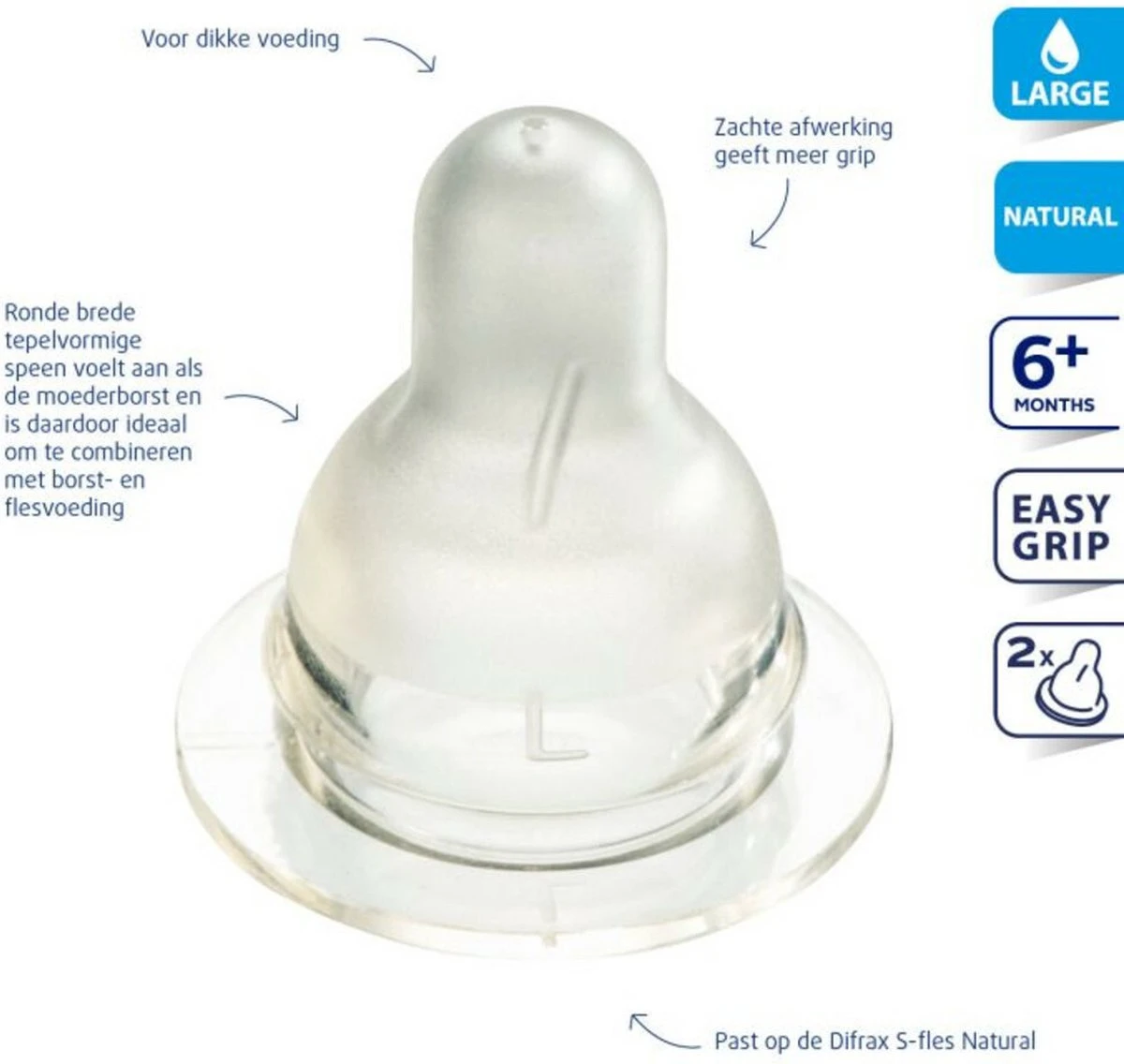 De Difrax Flessenspeen Natural Large voor de smalle S-fles heeft een zachte ronde tepelvormige speen die lijkt op de moederborst. Hierdoor is borst- en flesvoeding goed te combineren.