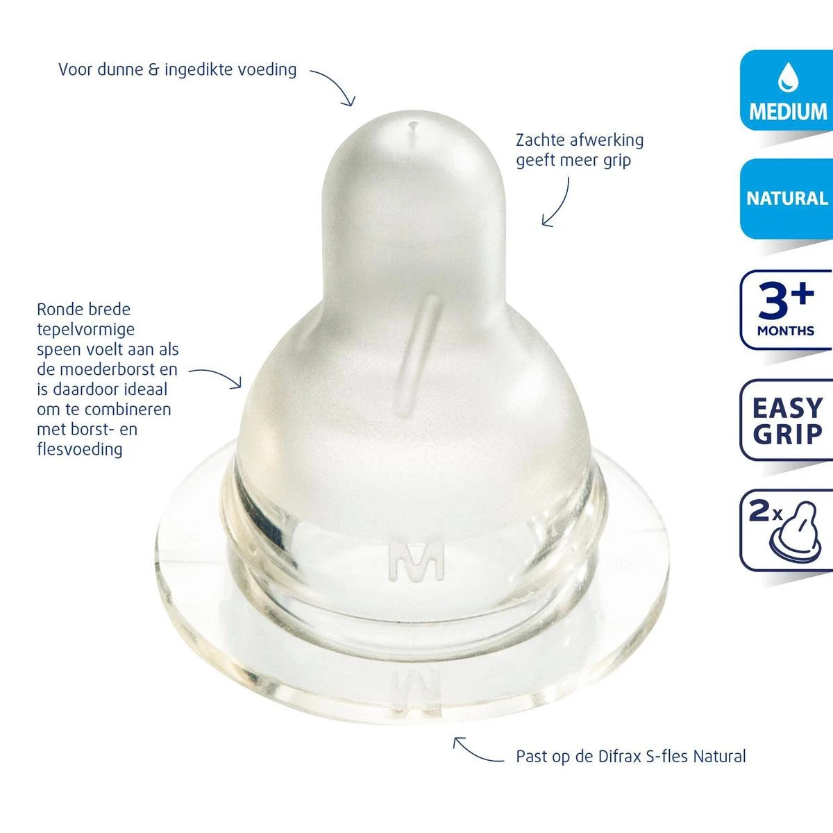 Medium: vanaf 3 maanden of als small te langzaam gaat. Geschikt voor dunne en dikke voeding zoals melkvoeding (borstvoeding of met melkpoeder) en pap. 2 stuks per verpakking. De speen is vervaardigd uit zacht, veilig BPA-vrij siliconen materiaal. Ontwikkeld door Difrax medisch team. Tip: Met de 1-2-3 speen en 1-2-3 ring van Difrax bepaal je de drinksnelheid van je baby, ook tijdens het voeden.