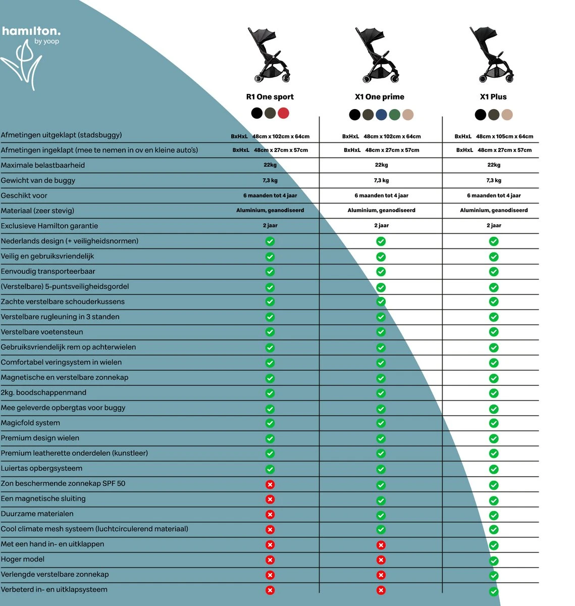 De, door verschillende vergelijkingssites aanbevolen, Hamilton by Yoop One Prime X1 is het premium model binnen het assortiment van Hamilton. De modieuze buggy is uitgerust met veel extra features en is gemaakt van uitsluitend hoge kwaliteit materialen. De kinderwagen is zeer comfortabel, gebruiksvriendelijk en gemakkelijk te transporteren met het behulp van het exclusieve MagicFold systeem.