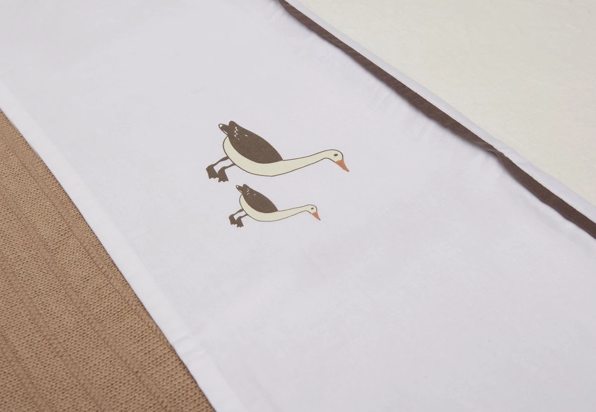 Het Goose thema is vrolijk met zijn schattige witte gansjes op een neutrale achtergrond van nougat of biscuit. In het thema vind je naast de lakentjes ook slaapzakjes van heerlijke stretchy jersey met een TOG-waarde van 0.5. Goose is een perfecte match met Pointelle dekentjes of Pure Knit dekentjes van Jollein.