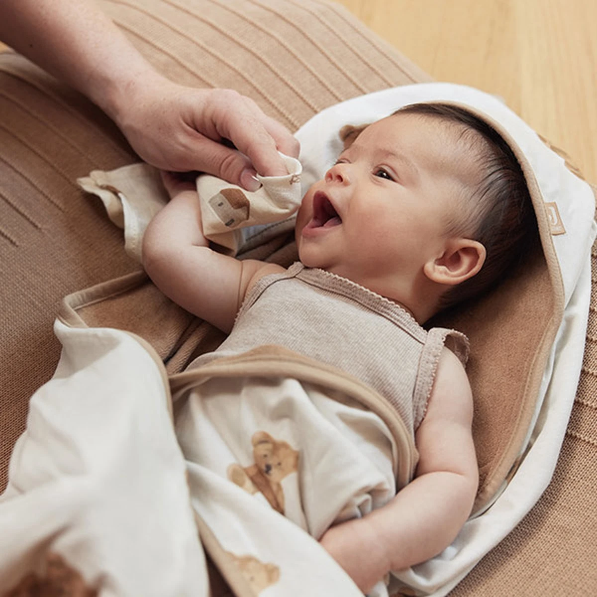 Na het badderen of zwemmen is deze badcape ideaal. Je wikkelt je baby direct warm in zodra hij uit het water komt. Met de capuchon bedek je het hoofd waardoor het daar ook geen warmte verliest. Comfortabel voor je baby! De badcape is gemaakt van 100% badstof katoen. De buitenkant is gemaakt van 100% Jersey. De zachte stof is mild voor de tere babyhuid en neemt goed vocht op waardoor het afdrogen in een mum van tijd klaar is. Na gebruik hang je de cape gemakkelijk op aan het lusje. De badcape heeft een afmeting van 75x75cm. Kleur de badcape heeft een super schattig printje van Teddy beertje. Liever zonder printje? Jollein verkoopt ook badcapejes zonder print!