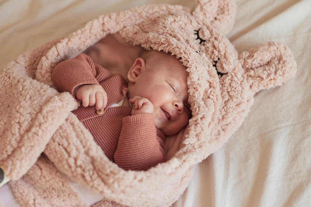 Wikkel je baby in deze omslagdoek en sluit de deken met de praktische klittenbandstroken. Zet het mutsje erbij op en zie daar, die schattige oortjes en dito konijnengezichtje op het mutsje. Echt te lief!
