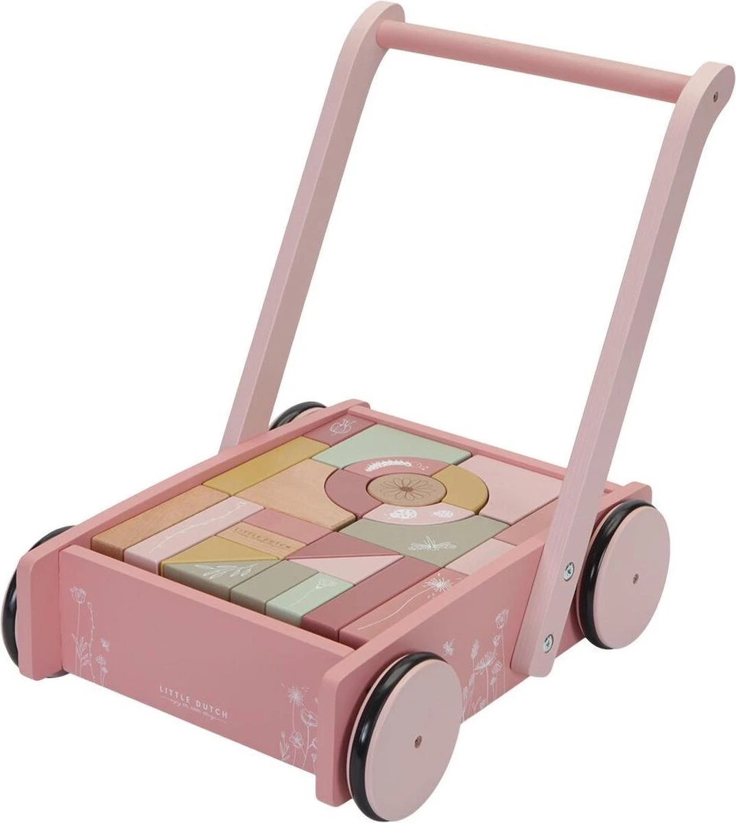 De bloktrolley is voorzien van houten wieltjes en gevuld met gekleurde houten blokken met daarop prachtige tekeningen van bloemen en insecten uit de Wild Flowers collectie. De verschillende maten van de blokken bevorderen de herkenning van kleuren en vormen door kinderen. Het handvat zit op de juiste hoogte voor peuters zodat ze fijn door de kamer kunnen stappen. Deze vrolijke kar vol blokken staat garant voor urenlang bouwplezier.