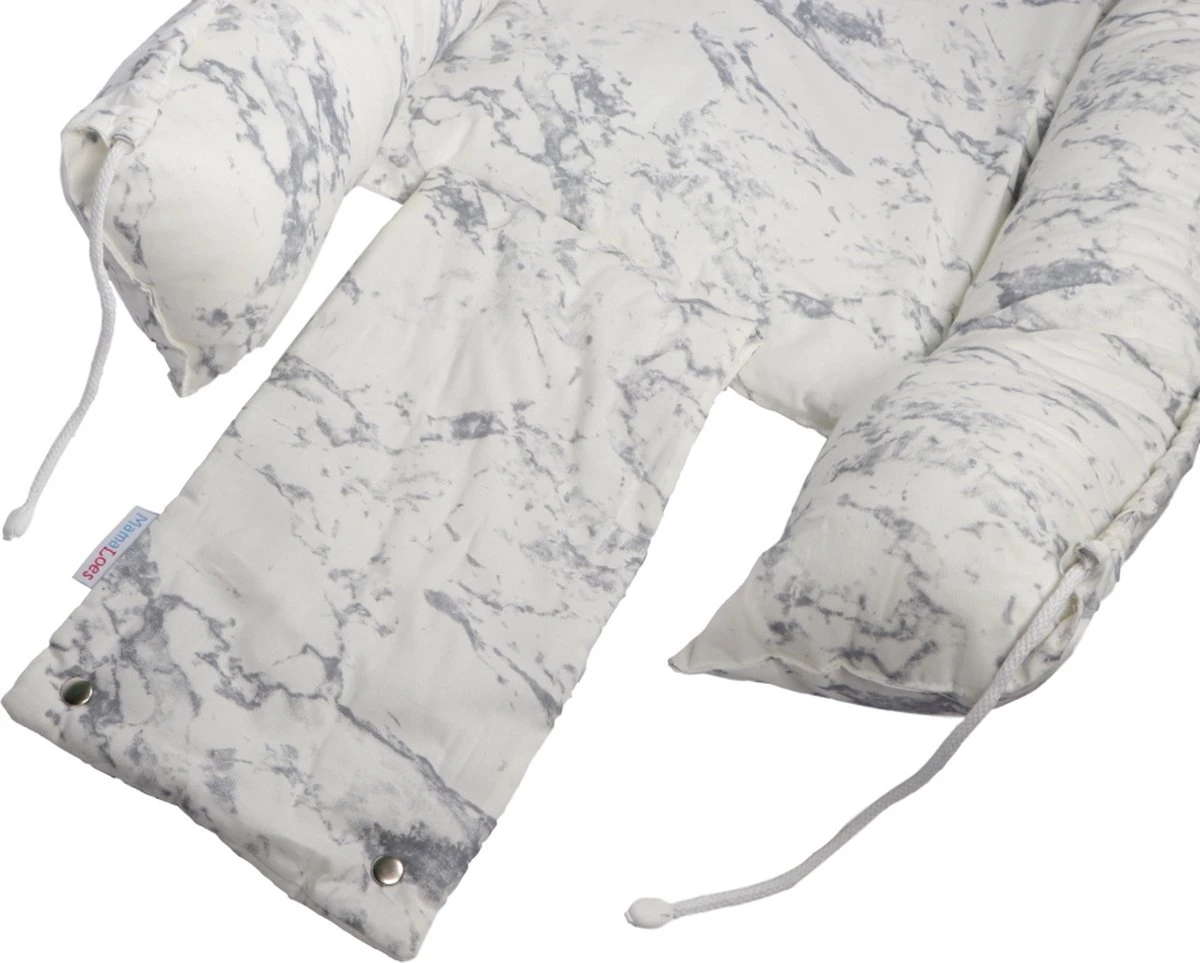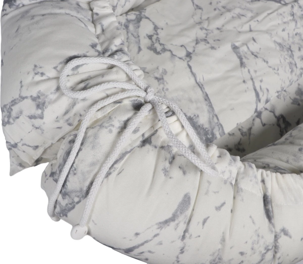 Dit babynestje is voorzien van een stijlvol marmer motiefje en gemaakt van kwalitatief zeer goed materiaal. De buitenkant van dit nestje is gemaakt van 100% katoen en de vulling is gemaakt van 100% polyester. Mocht het nestje vies zijn geworden dan kan je hem met de hand wassen op 40ºC. Dankzij de koordjes kun je de uiteinden van het babynestje makkelijk dicht binden. Het extra lapje met drukkers zorgt ervoor dat je kleine niet bij de touwtjes kan.